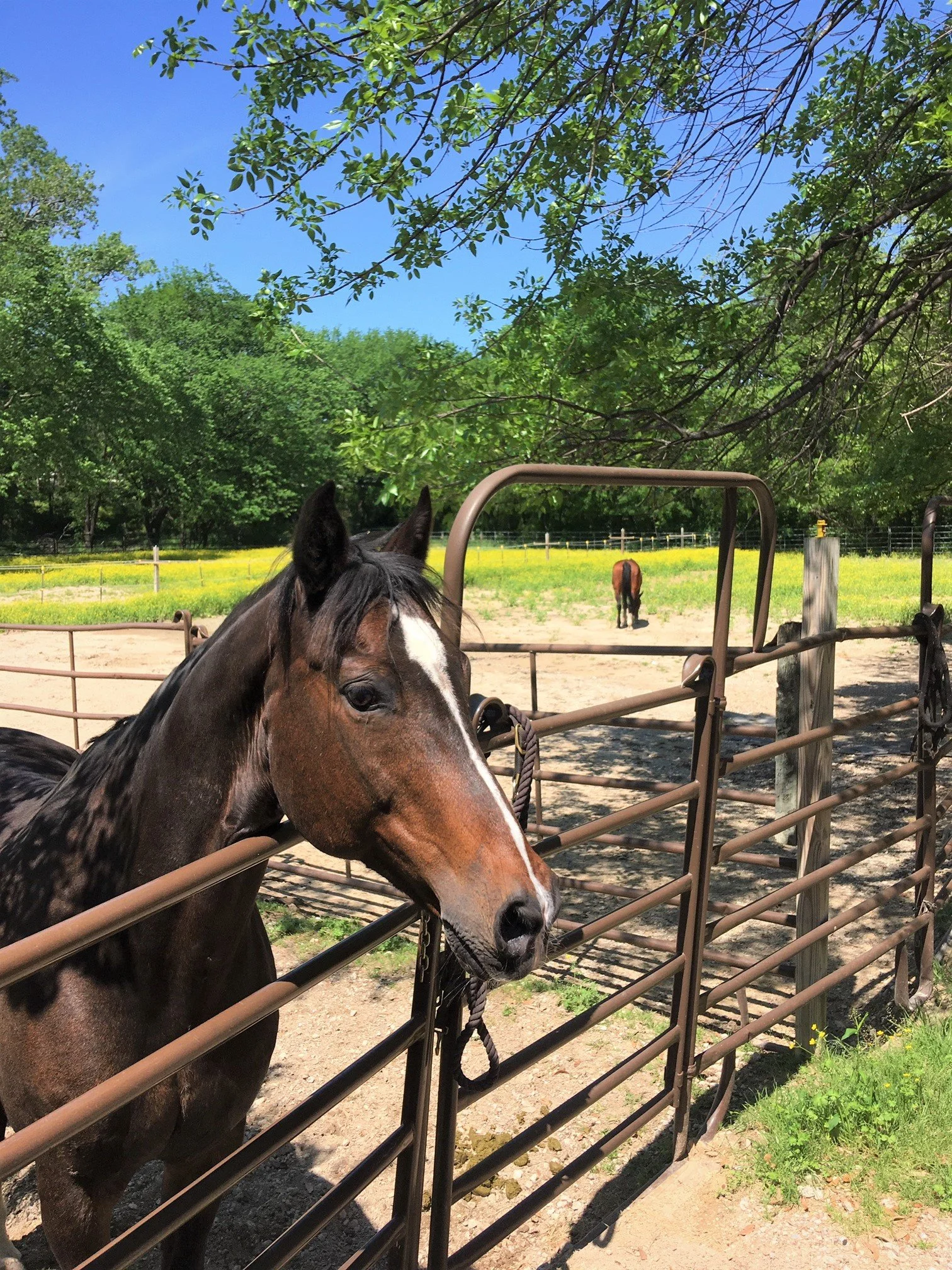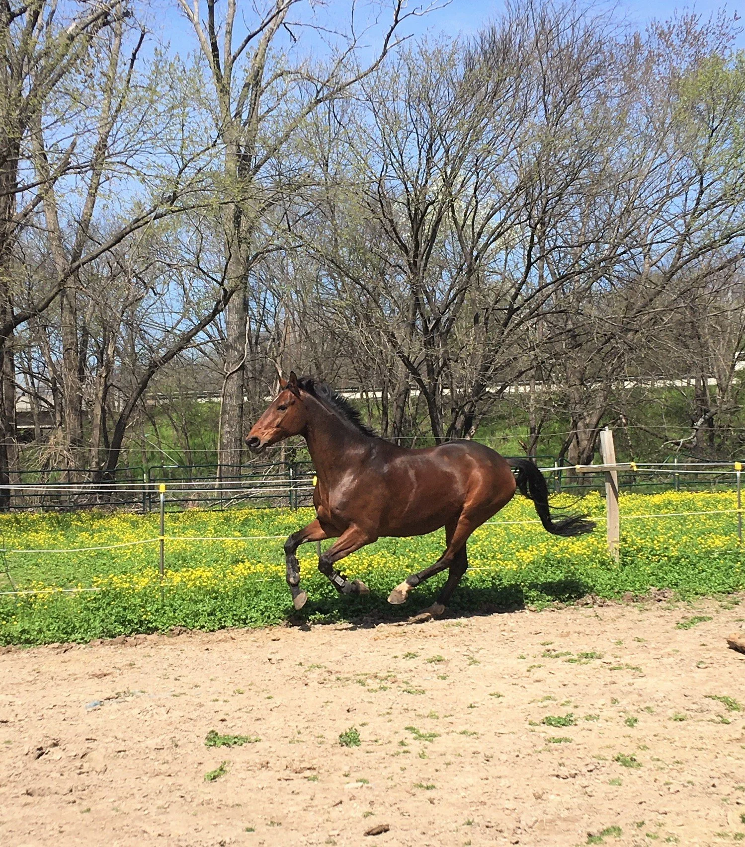 All horses are turned out daily for several hours in pairs or alone, as weather allows. For rainy days, horses will be turned out in the covered square pen during stall cleaning.